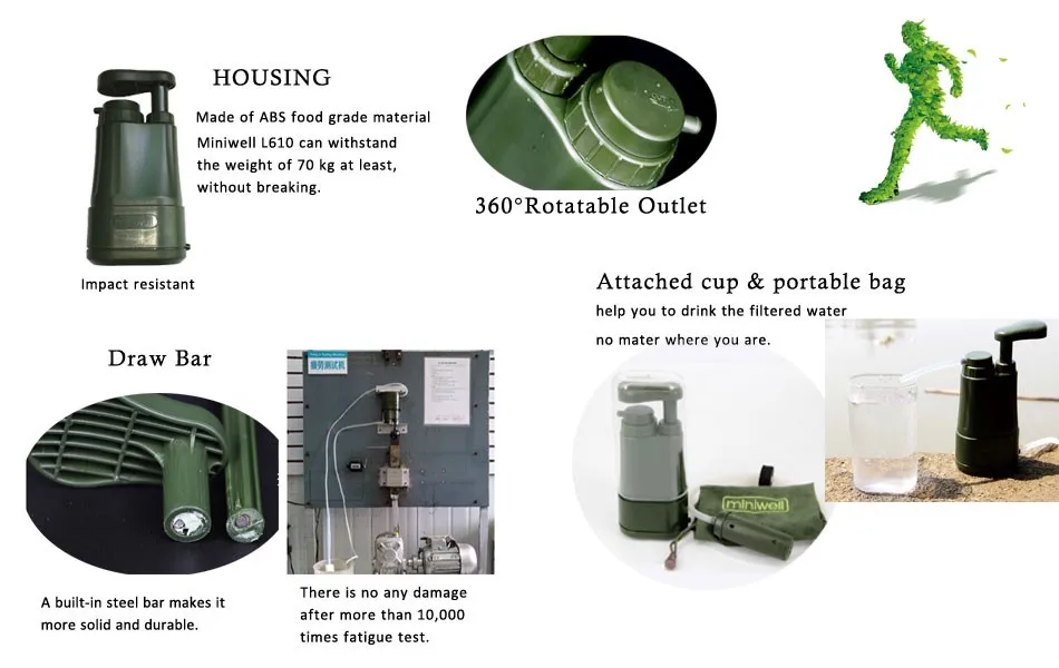 Adventure Water Filter L610 enables users to drink clean great-tasting water from renewable natural fresh water sources. It is effective against bacteria (Salmonella, Cholera, E coli, etc), protozoa cysts, and virus, also removes residual chlorine, unpleasant taste, odor and color. Miniwell portable water filter is ideal for hiking & camping, travel, emergency preparedness and survival. Because L610 is portable and lightweight, it is also great for travelers who do not want to rely on the quality of local water.